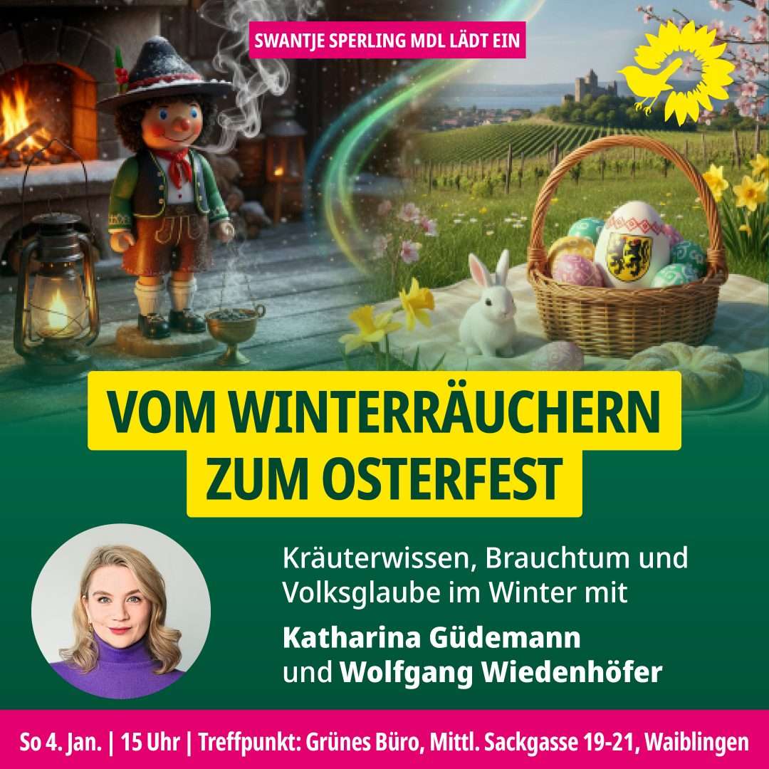Am 4. Januar um 15 Uhr lade ich dich ganz herzlich zu meiner Veranstaltung mit Katharina Güdemann und Wolfgang Wiedenhöfer „Vom Winterräuchern zum Osterfest“ ein. Treffpunkt ist das Grünes Büro, Mittlere Sackgasse 19-21, Waiblingen. Zum Ausklang bist du recht herzlich zu Gebäck und Punsch eingeladen.